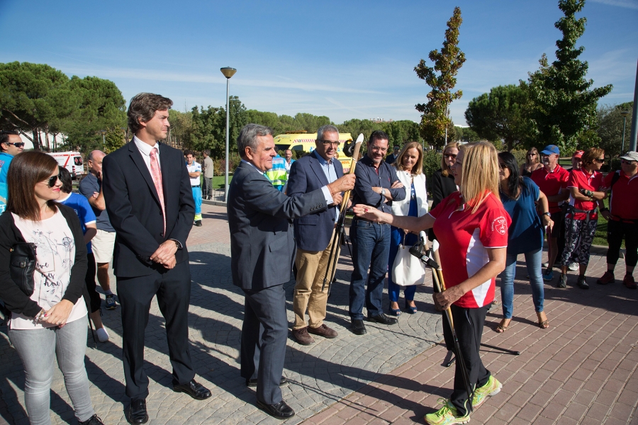 El Consejero de Políticas Sociales y Familia, Carlos Izquierdo y el Alcalde de Majadahonda, Narciso de Foxá han asistido esta mañana en el Gran Parque Felipe VI de la localidad al entrenamiento y salida de la I Marcha Nórdica de la Comunidad de Madrid.