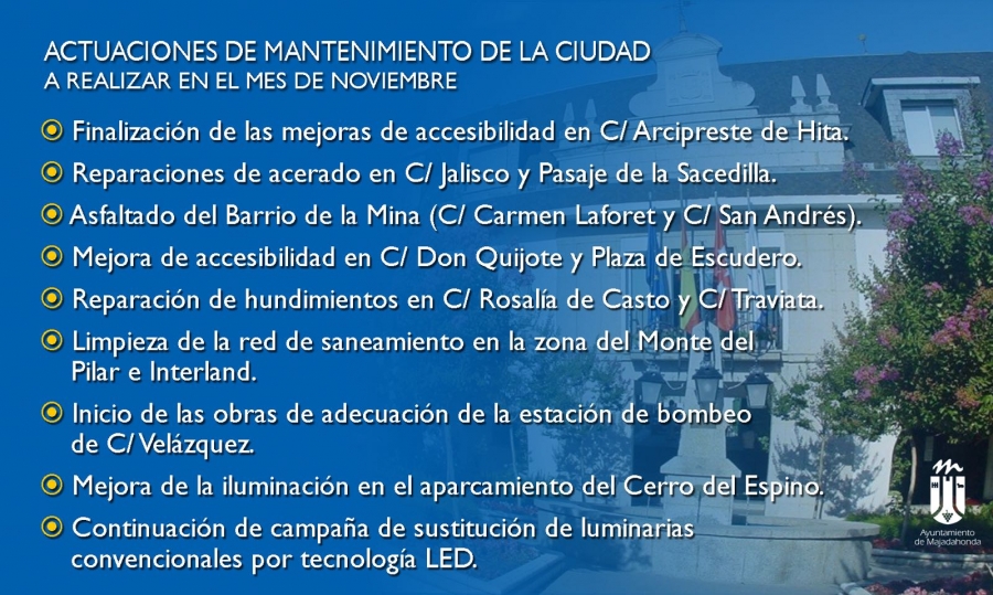 Respecto al saneamiento, la concejalía ejecutará la limpieza de la red en el Monte del Pilar e Interland; continuará con la renovación de las tapas de saneamiento y de reparación de los pozos de registro y ejecutará nuevos imbornales en la calle Ecuador con la Avenida Reyes Católicos y en carretera de Las Rozas.