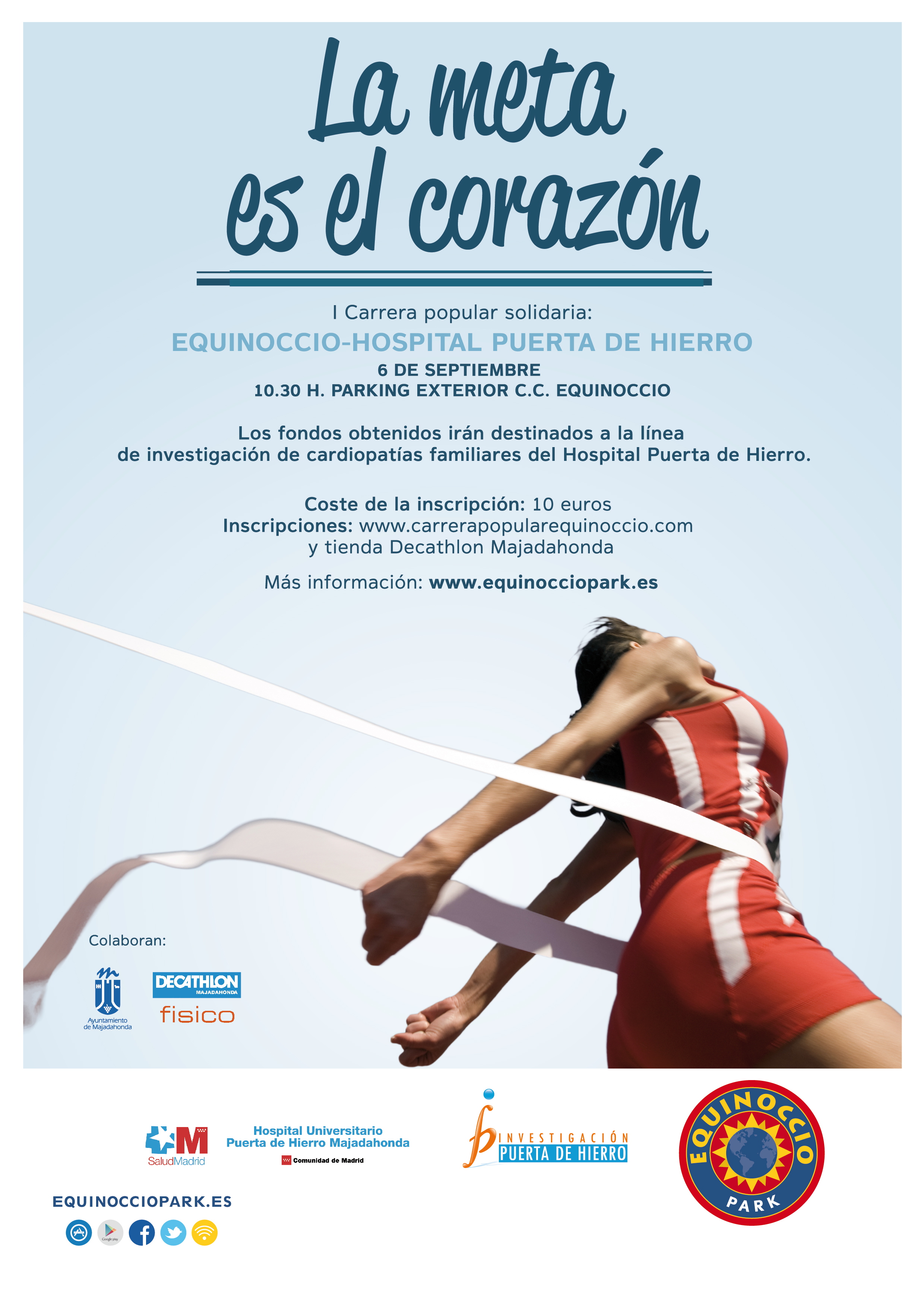 El Centro Comercial Equinoccio y el Hospital Puerta de Hierro Majadahonda han organizado la I Carrera Solidaria “La meta es el corazón”, cuyo objetivo será recaudar fondos a beneficio de la Fundación Puerta de Hierro, destinados a la investigación y el tratamiento de enfermedades coronarias.